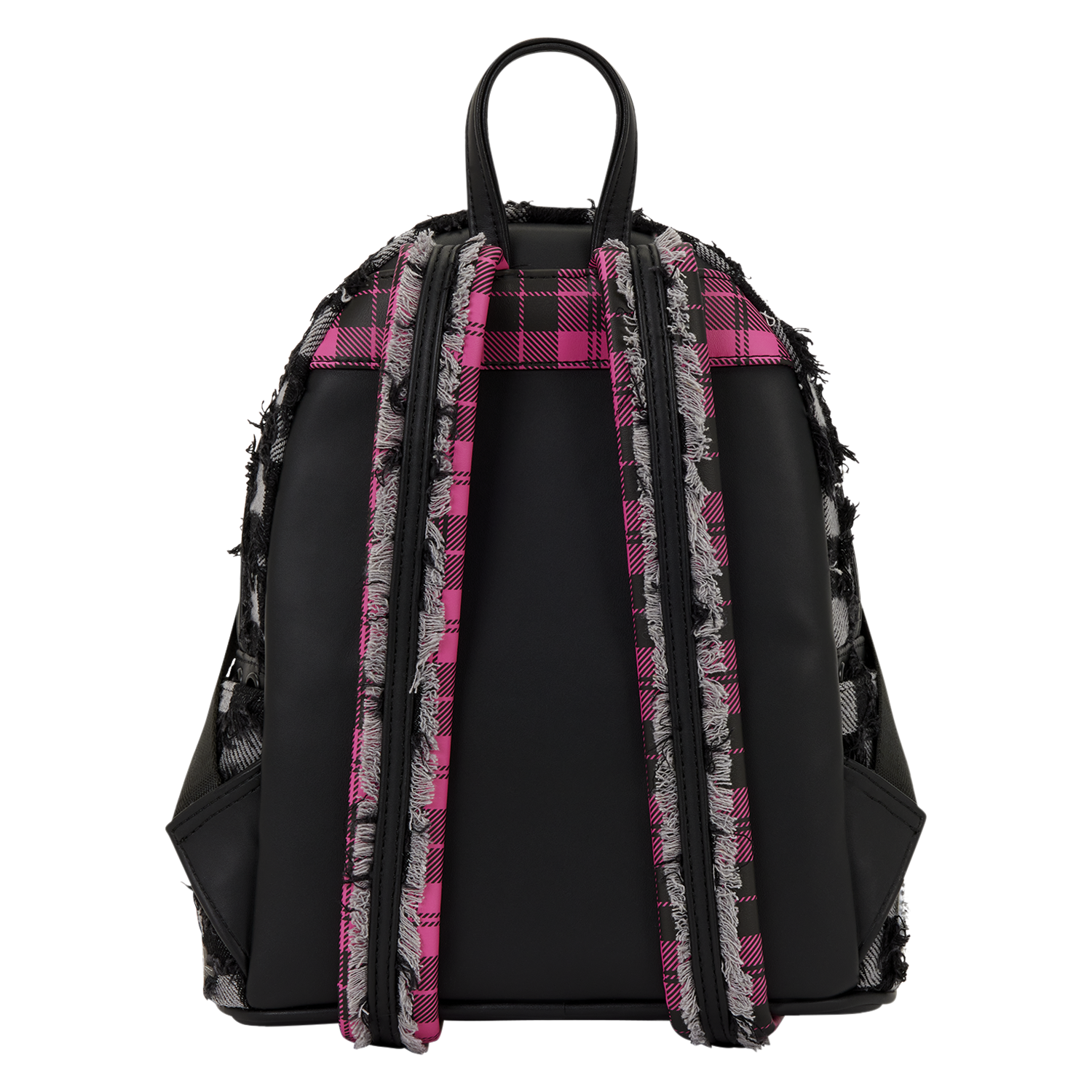 You’ll find a heart-shaped front pocket featuring black-and-pink plaid and a skull and crossbones. Black-and-pink plaid covers the straps, too. The rest of the bag has a black-and-gray checkerboard pattern with embroidered silver stars. Distressed denim, glitter, and star studs bring this whole look together.