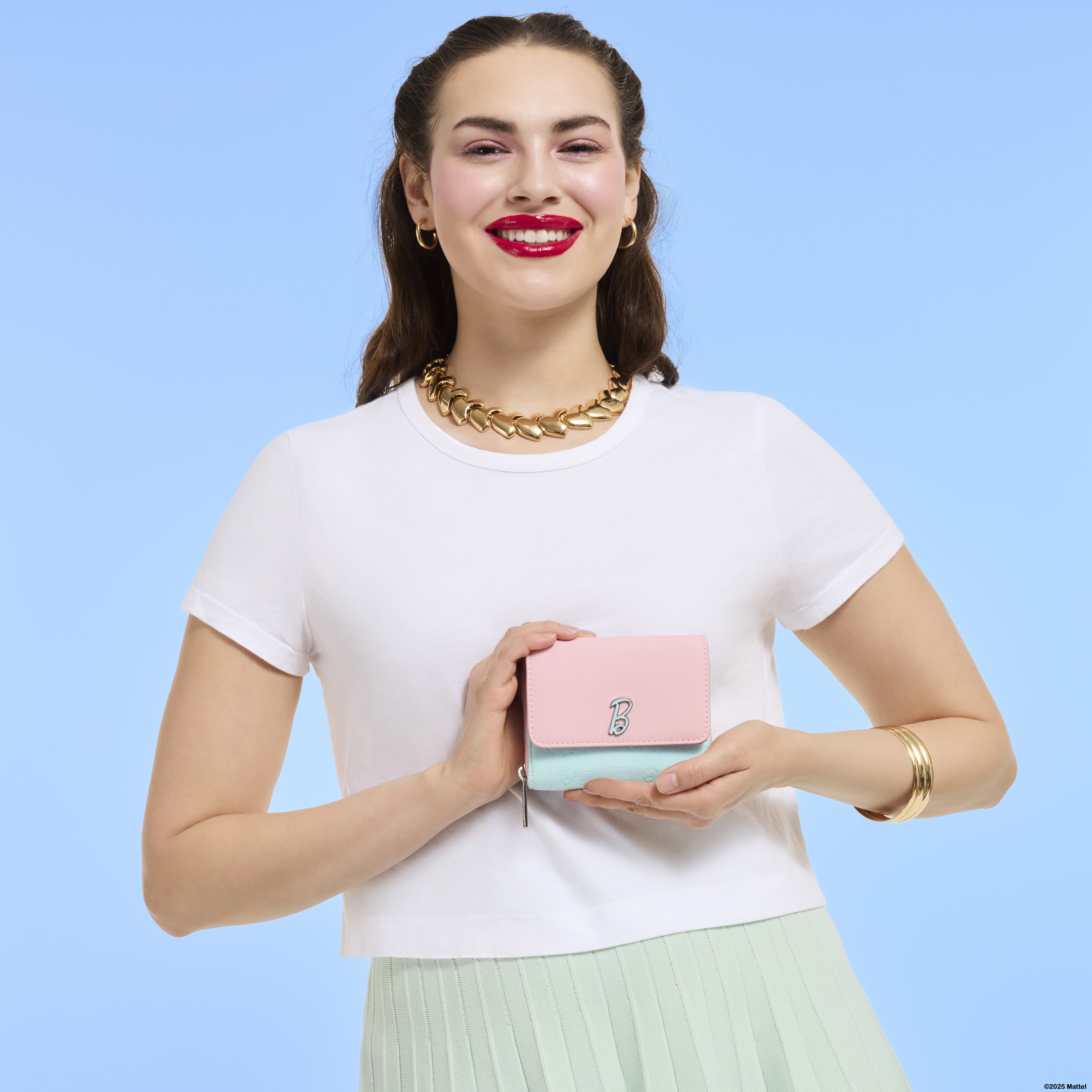 This wallet features terry cloth material with the Barbie “B” logo “burned out” of it. A pink top flap features an enamel charm of the Barbie “B” logo. Inside, you’ll find five card slots and one clear ID slot.
