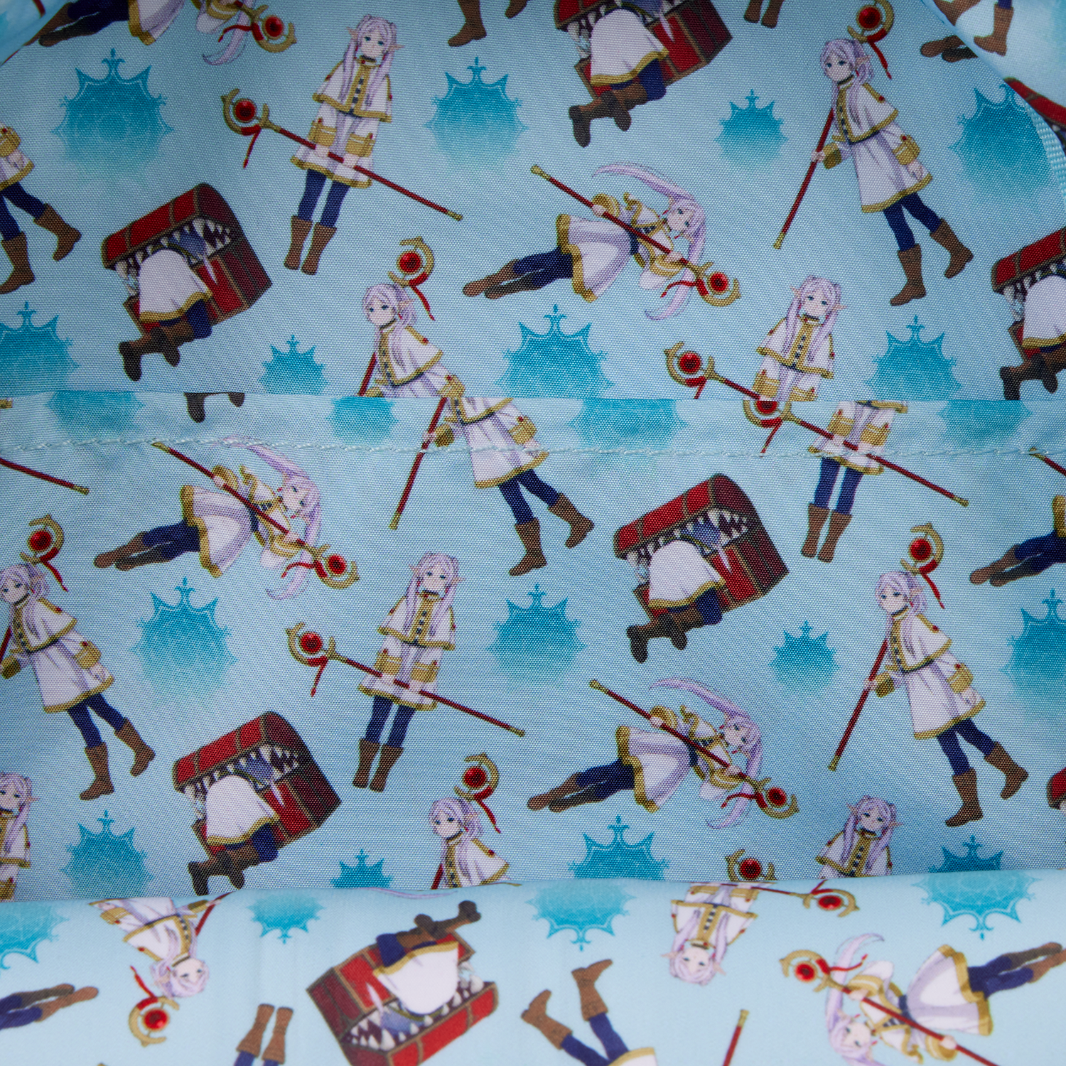 This mini backpack pays tribute to Frieren’s ensemble, complete with satin material and gold and red details. You’ll find a charm of her staff as the zipper pull on the front pocket. Turn the backpack around to find an image of Frieren on the back!