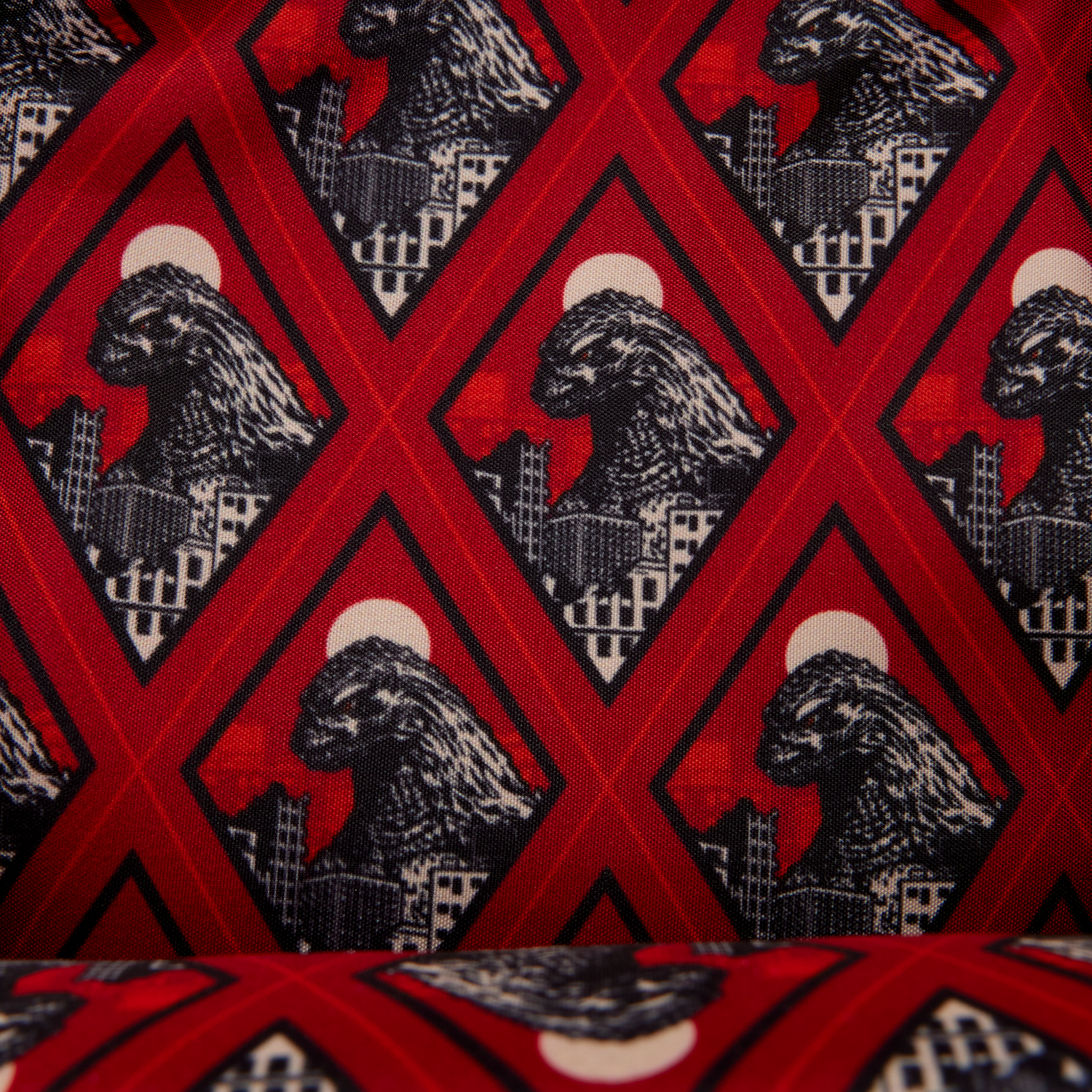 The front pocket features an image of Godzilla towering over a cityscape. A red sky is behind him. The rest of the bag is black and features scale-like designs over it. Attached to the crossbody strap is a detachable coin bag featuring an image of Godzilla’s footprint. It’s a fun piece that makes a statement and shows off one of your favorite monsters!