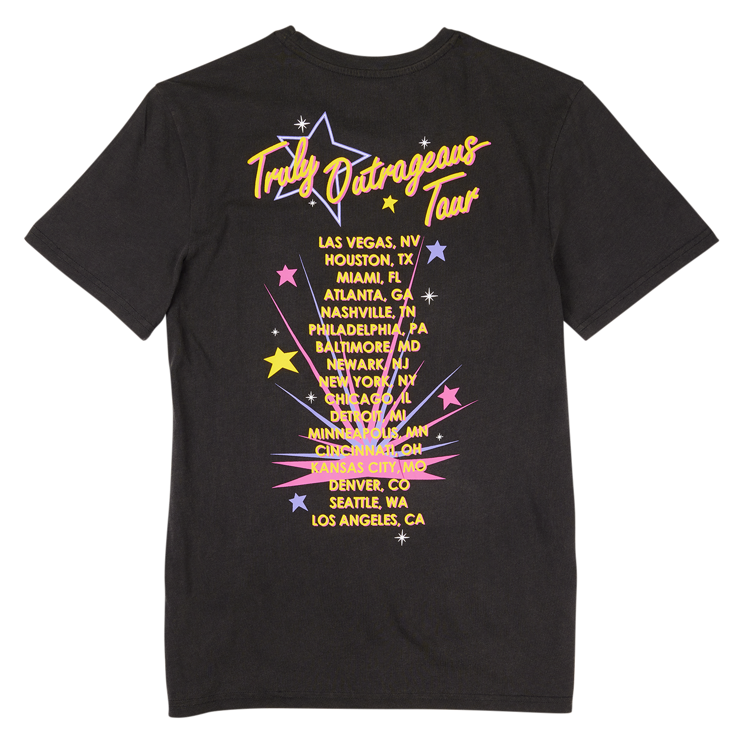 This tee features Jem and the Holograms on the front, embellished with real rhinestone details. Turn the tee around to find the cities listed from the “Truly Outrageous Tour.”