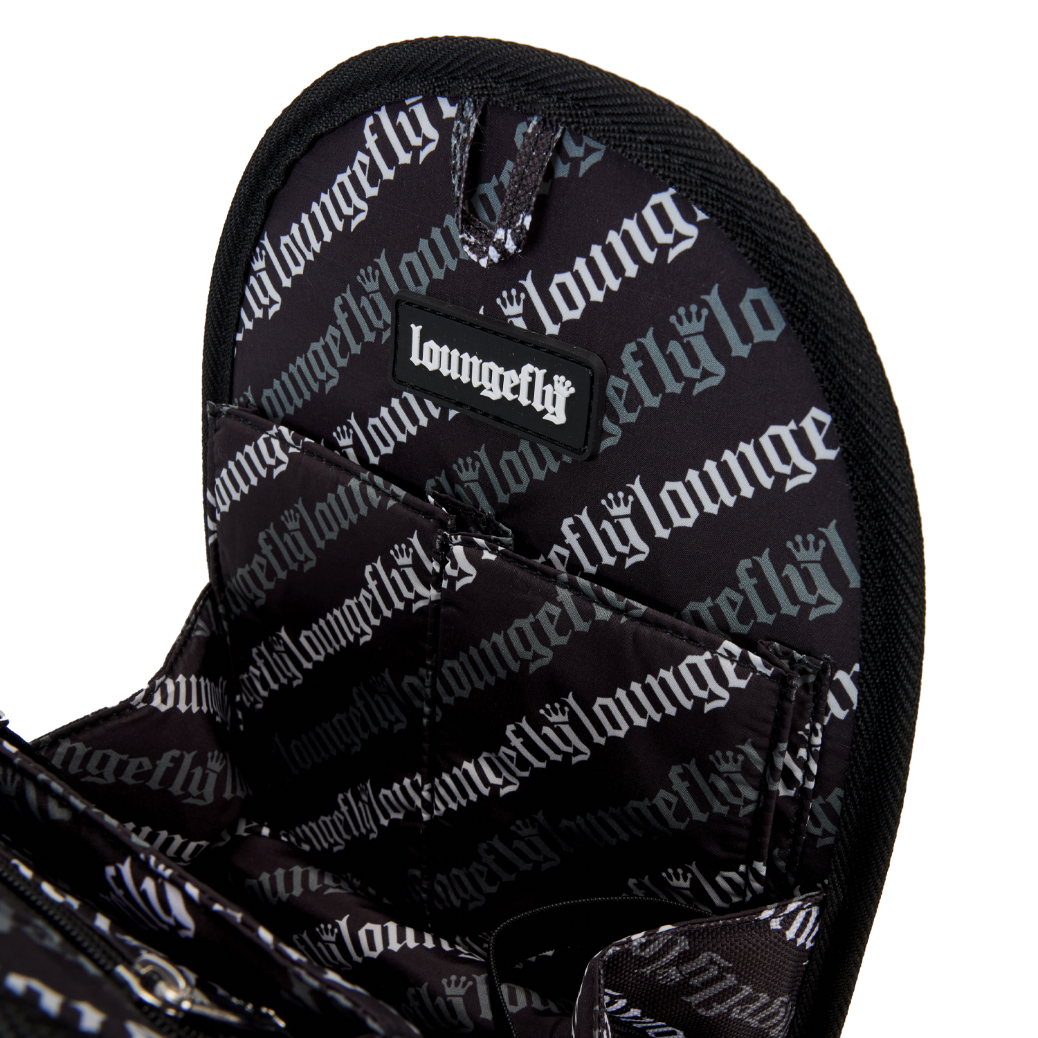 The Loungefly Mini Backpack Insert Organizer is made of nylon and features collapsible patch pockets, drop pockets, utility loops, lobster clips, D-rings, and printed details.