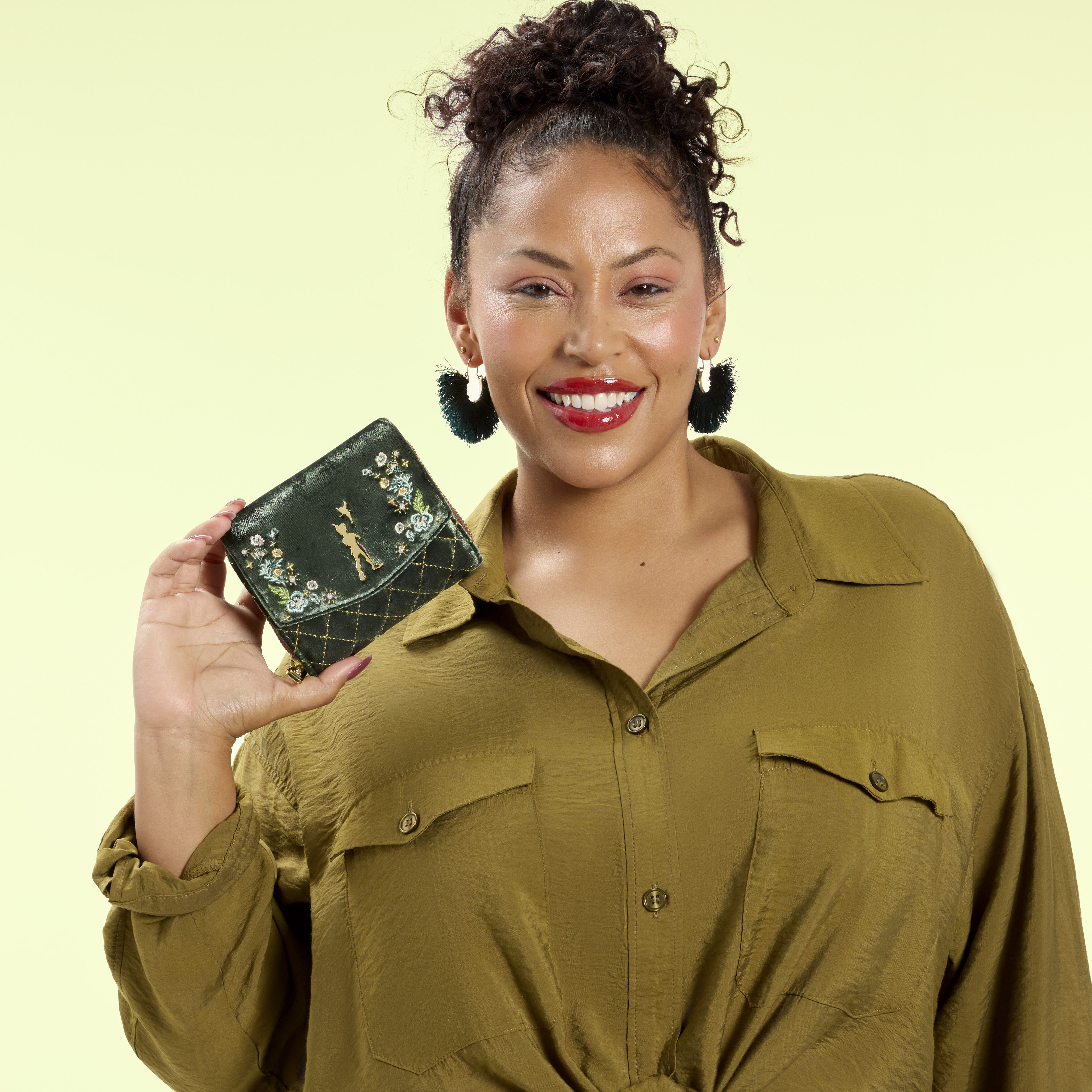This wallet features green velvet with golden details. On the top flap, you’ll find a metal charm of Peter as well as embroidered florals and faux pearls. Inside, there are five card slots and one clear ID slot. It’s the perfect accessory to add some Disney magic to your day!