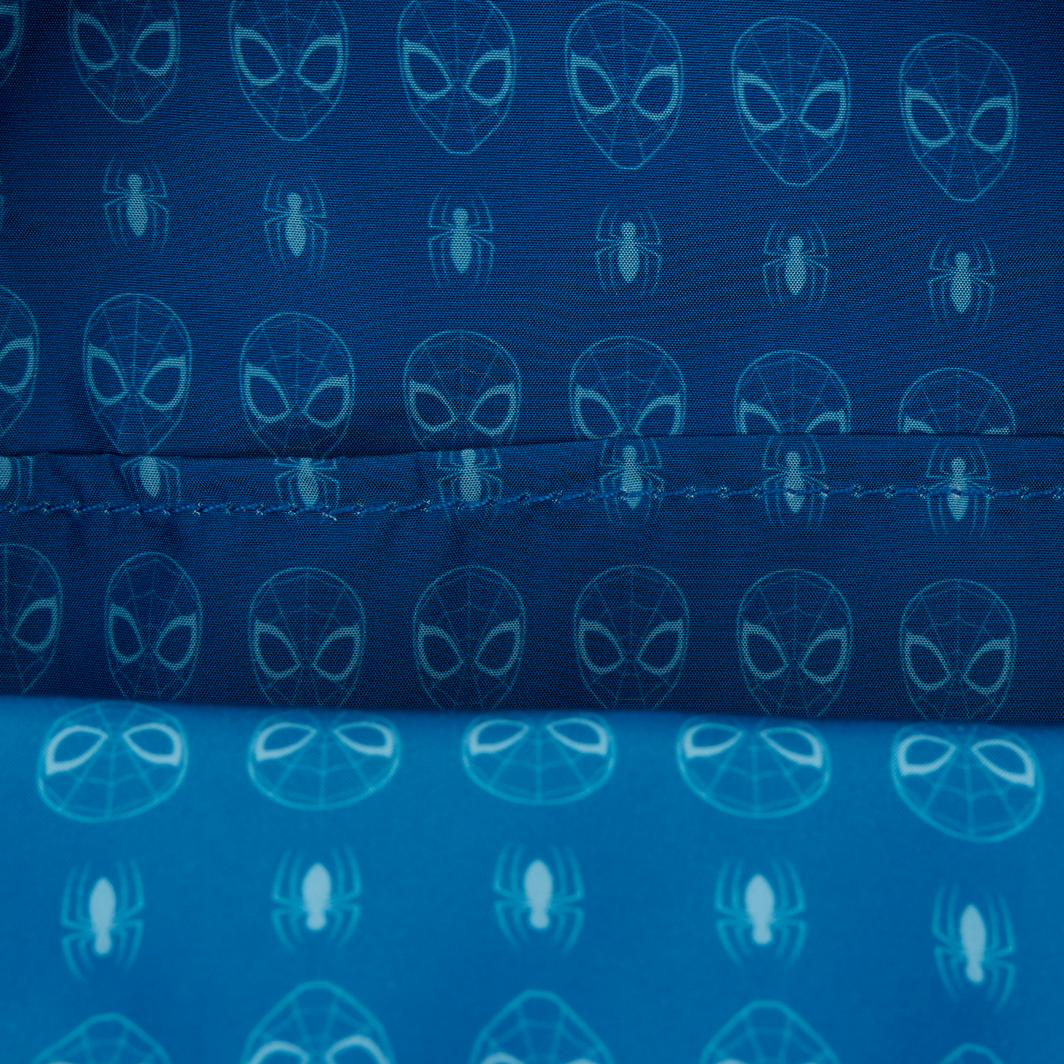 This mini backpack features a sherpa, heart-shaped front pocket featuring Spider-Man’s mask. All over the rest of the bag, you’ll find various symbols of Spider-Man in squares that look stitched together. Plus, the zipper pull on the front pocket features Spider-Man’s mask!